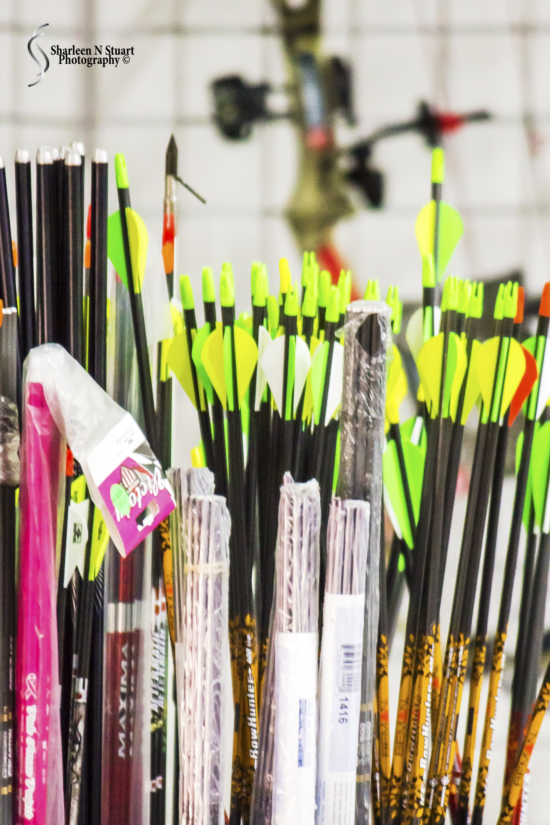 Arrows of different colors, and shapes and sizes are in bins for the clients to purchase. There are also bins of arrows for clients to use when they practice, if they do not have their own.