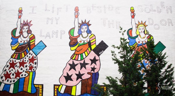 Wherever I looked, there was something to see, and most of the time I was a good couple of yards behind my other 3 travel mates. I think every so often they were forced to stop and look for me. Randomly this cross below stood out to me in the middle of the city scene. I had no idea what the three women were meant to represent but I looked up what the words meant, and the Golden Door is meant to be a beacon of promise encouraging immigrants to embrace a new land and what it offers. The words “I life my lamp to the Golden Door” is the final line of the poem “The New Colossus” written by Emma Lazarus.