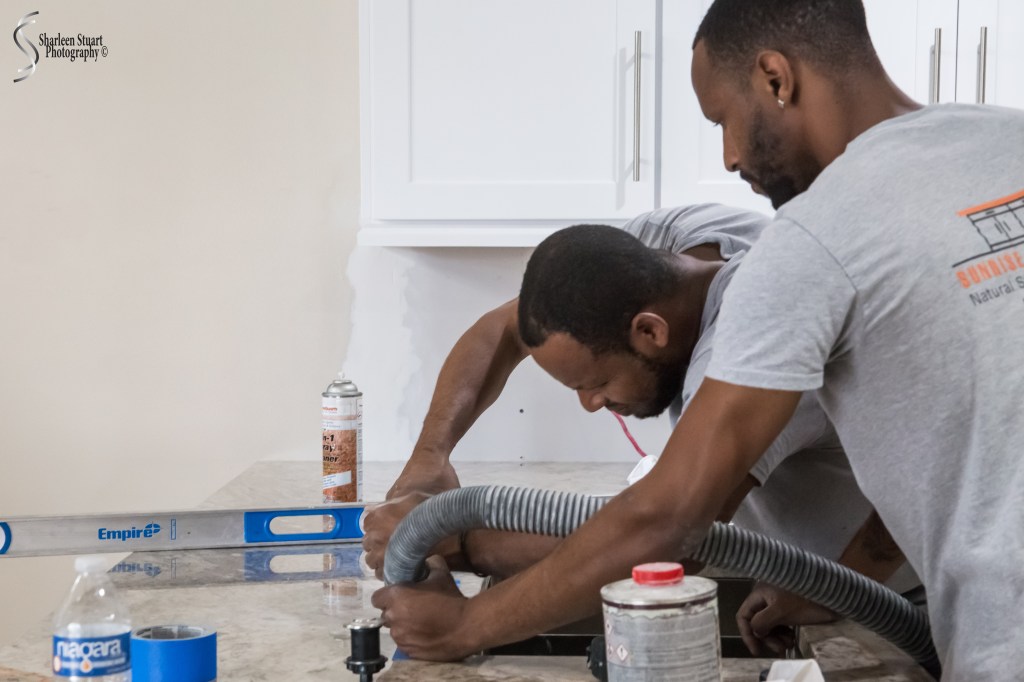 They did it. I was impressed and relieved because I was not going to be able to get another slab if that one got damaged. Once the slab was laid, the basins were fitted, the holes for the tap and garbage disposal button were drilled and the counter top was polished.