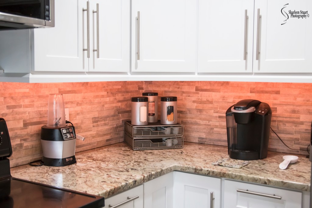 Last little trick Richard came up with, which is very nice at night. Under cabinet strip lighting. These are cheap fancy lighting. They change color, and can be really bright or dim as you need them. He likes the blueish color and I like the warm tones of the orange. It is nice to dim them at night when you go to bed. If for any reason you find your way down the stairs there is some light in the kitchen to welcome you.