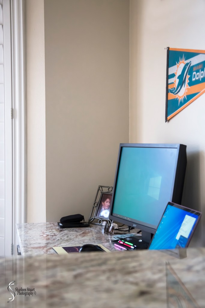 Last item we had cut out of the slab was a counter top that would function as a desk for Richard. We moved his old desk out of the area and he bought two units that were stand alone drawer and filing cabinets, and we had the second piece laid on top of that. It could be used as a serving area, or at some point it could be put onto high pedestals and made to be a high top table. We are trying to think outside the box :). In the meantime, that is his workspace, and mine is upstairs in one of the bedrooms.
