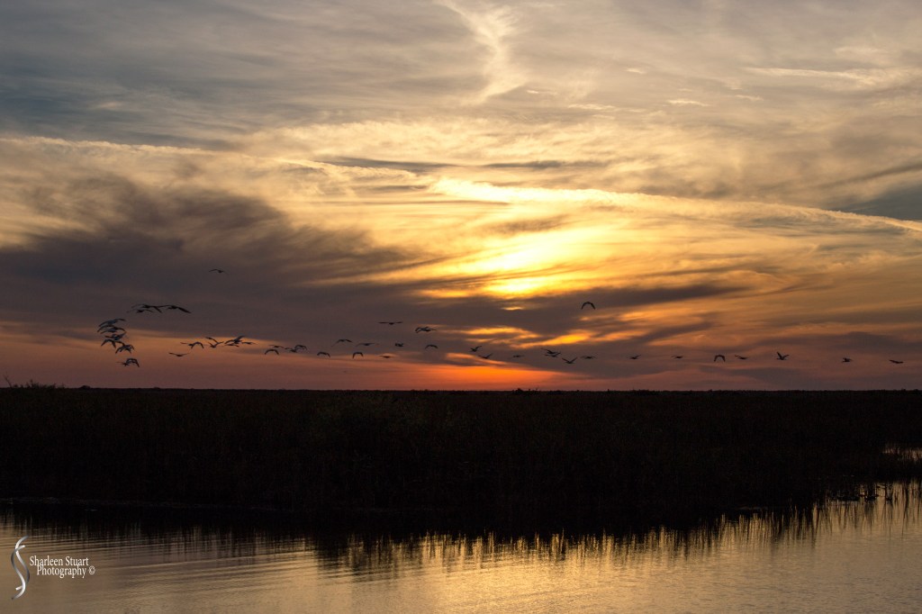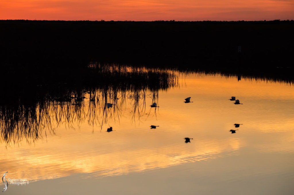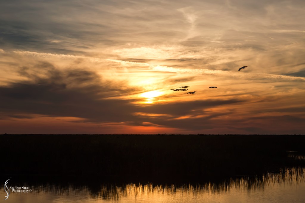From here on out it was a case of changing lens to get wide angle, a bit closer, much closer and super close. One of my favorite things that typically happen at sunset is the birds flying by. Quite often, although it did not happen this evening, you get to watch the murmuration of the grackles and that is a beautiful dance in the sky. Below is a flock of Ibis flying by.