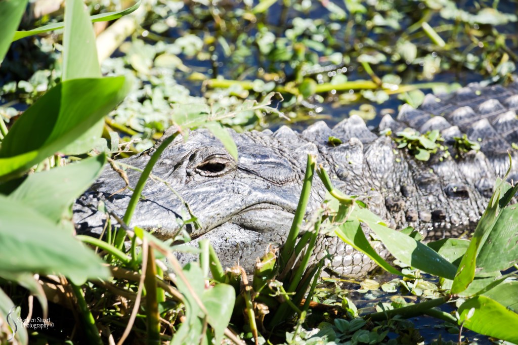 As I continued along the walkway I spotted this Great Blue Heron wading in the water looking for lunch. I love them, To me they are majestic birds. We used to have one come to our back garden. Clearly someone had been feeding him and he was looking for that. I did not want to have him become dependent on me feeding him, but I would throw bread out for the fish in the canal so that he could go fishing. He would come by every day for the the summer and then he just disappeared. I used to call him Big Blue. Hanging out in the same waters sunning itself in the sun, fortunately for the Great Blue Heron, was another of the parks Alligator.