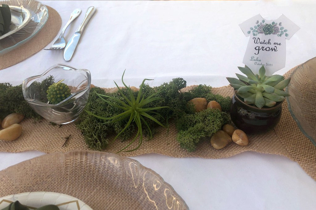 Fortunately I have table cloths and chair covers from Cameron’s wedding rehearsal, and Amy’s wedding that we had at home. Once again I borrowed tables and chairs, and then settled on green and champagne colored tie backs. On the center of the table, I wanted to keep the decorations low and only have one center bromide that stood higher. I ran a burlap strip down the table, then added moss (from home depot), and pebbles, along with fake air-plants, succulent candles in vases, along with the cutest little takeaway succulents in pots with a “Watch me grow” sign.