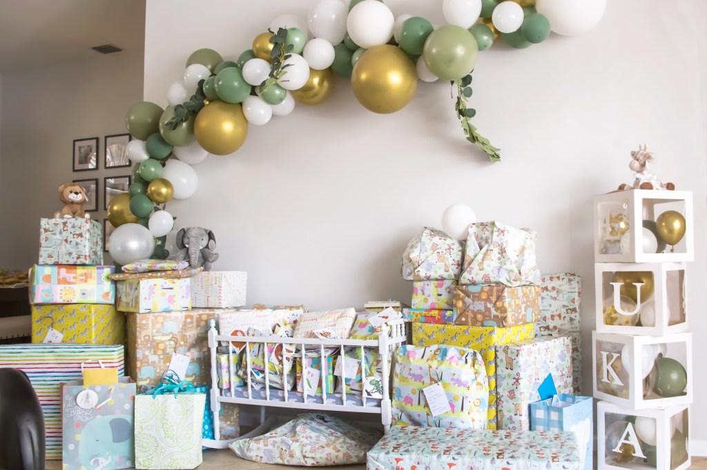 Last but not least, it was present time. The balloon arch was fun blowing up. There had to have been about 50-75 balloons that needed to be blown up. Fortunately I bought hand pumps. The boxes were so cute, and filled with balloons. I added the animals because we are South African and I wanted little Luka to have a connection to his family culture. The crib has a 90 year old history in my husbands family line, and I filled it with all the smaller presents (probably most of which I had had fun buying). I know that by the end of the present opening Amy and Daniel were exhausted, overwhelmed and spoiled. She said there was very little that she needed to buy for the baby.