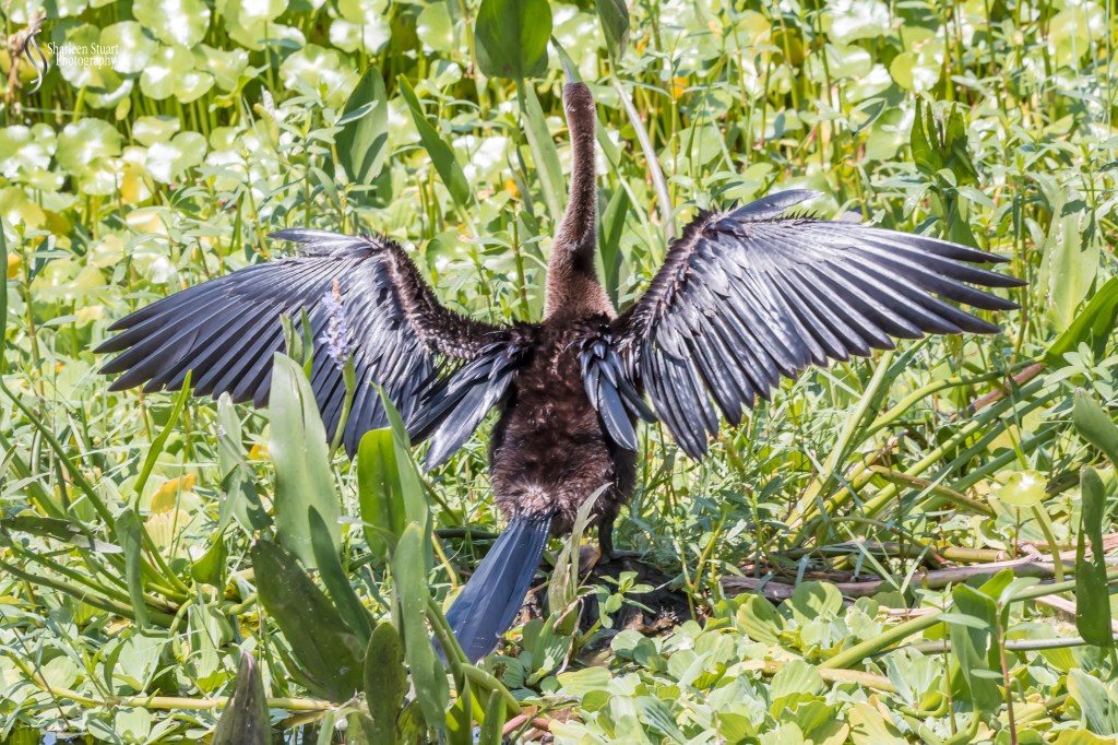 This is a female Anhinga. They fish for their food, and then once they have finished they will fly to the closest dry spot and they spread their wings and wait for them to dry. The way I understand it, they cannot fly to far with wet wings. I am always in awe of creation and how each wing interlocks with each other to enable a bird to fly. The male of course is far more interesting with white and black wings.