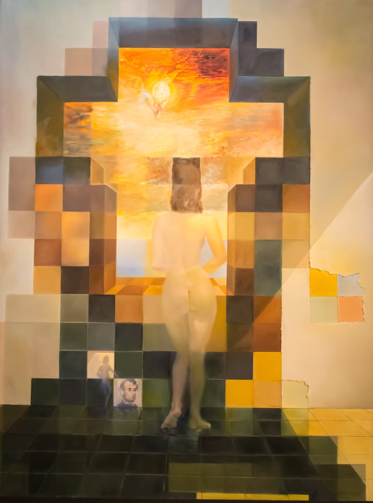 Below is a stunning image of a Woman looking out on a sunny day. The title to the artwork says the following ” Gala contemplating the Mediterranean Sea which at Twenty Meters becomes the portrait of Abraham Lincoln – Homage to Rothko (Second Version). When I look at the image in a small version I see Abraham Lincoln perfectly. When I look at this image I see Gala contemplating the Mediterranean Sea.