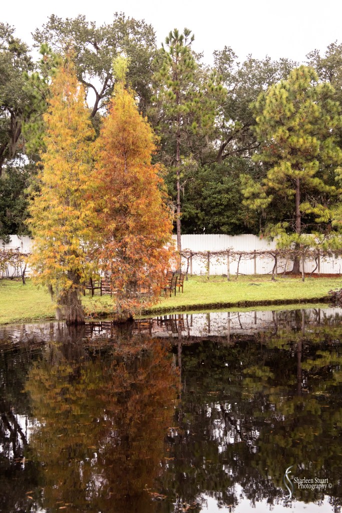 From the tasting room we headed outside to a large covered patio, nestled against the small dam. Growing on the edges of the dam were these beautiful colored trees. Beyond the dam was a covered outdoor private gazebo, where a wedding was taking place.