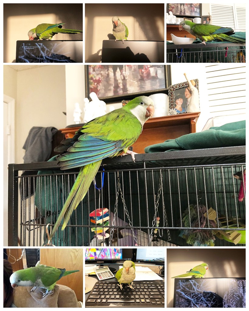 Last but not least, so the saying goes, was Houdini. Houdini was a rescue Quaker Parakeet. I was heading back to my office in early March 2020, when I spotted all the staff standing around the entrance to the offices. What I discovered was rather a dazed parakeet clinging to the edge of the window sill. Clearly in trauma, I was able to stroke him gently without him biting me and then get him onto my hand. My idea was that I would take him to my personal office and then phone around and see if he had been reported missing. He took off from my arm and flew around the office, eliciting screams from those who do not like birds :). He finally landed on my chest and I decided I would take him back outside and let him fly off. Which clearly he didn’t do. So it was back to my office. Given that it was a long weekend, I had to transport him home. So I shot out to the local Pet store and bought him a small cage, and off we went home. Richard was not overly happy that we had another animal in the house but he hung in there. I kept checking but no one claimed Hoo, so he stayed.