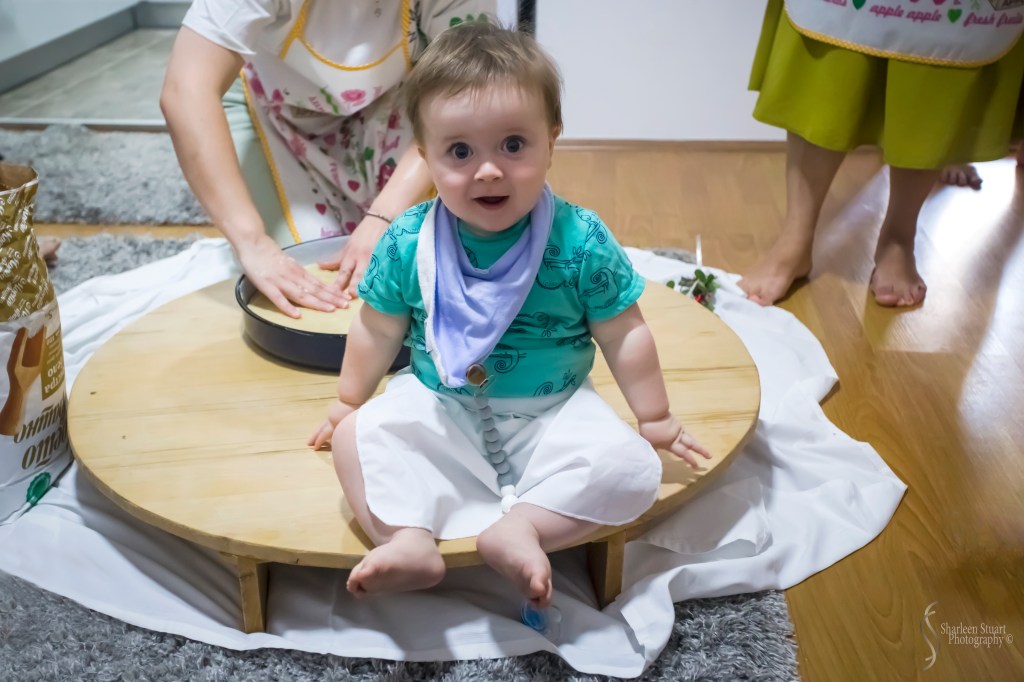 Aside from the greeting I was there with a purpose. Daniel was taking Richard for a beer, while Amy, Luka and I were joining the traditional bread making ceremony. Traditionally the family of the unmarried bride host a bread making ceremony. However, in this case, Daniel’s mom hosted the ceremony. The bread is shape in a round circle to symbolize something that has no beginning or end. Daniel’s young cousin, was the lady who made the bread. First the dough is made and kneaded, then it is patted in to the round dish, then Luka (who it appears is the star of the show) had to give his foot stamp of approval. While we were not looking a coin was placed in the bread mix, then Daniel’s cousin and his aunt created a beautiful design on the bread. and finally Daniel’s mom placed butter and oil onto the top of the bread.