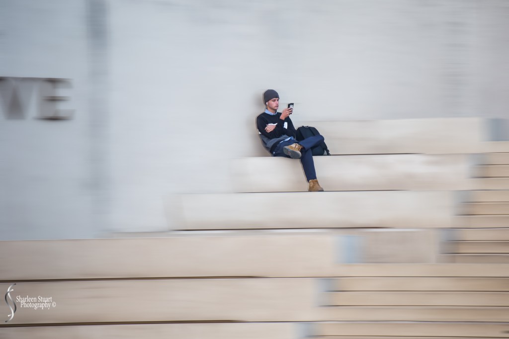 This is probably my favorite of the images I played with. Instead of blurring vertical, I blurred horizontal. This was taken the morning we went to watch the sunrise over the Opera House. This guy was randomly sitting on the steps listening and looking at his phone.