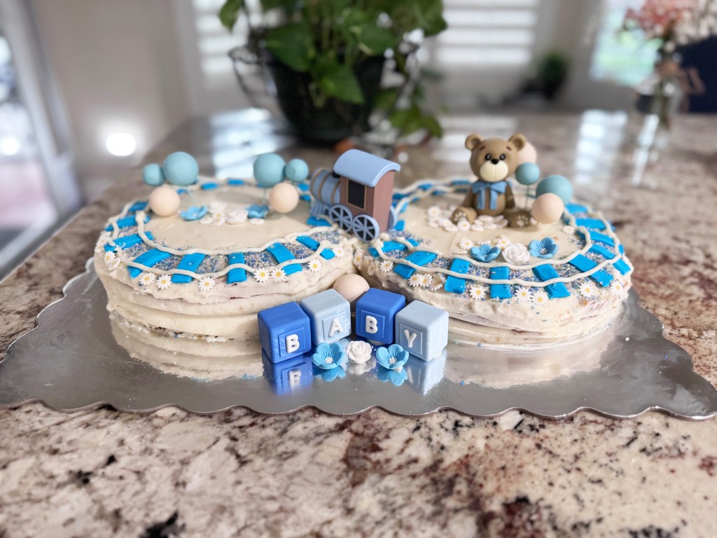 Seems like we have had a number of new babies added to our office space and this week we celebrated baby number 2. I have had fun trying to come up with different themes for the babies – 2 boys so far, but the next one is a little girl. I had not put it in at this stage because I needed to transport the cakes to the office, but behind the balloons on the less decorated cake would go a “It’s a boy” sign.