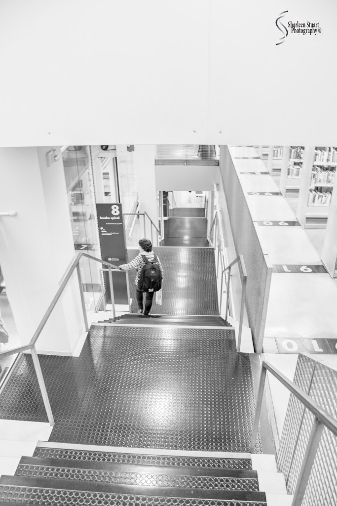 Some of my favorite set of stairs while traveling were found in Seattle. The next two were taken in the Seattle Library. It was 10 floors, we took the elevator to the top and then started walking down the stairs to each level. The escalator goes from the basement floor level up to the ground floor level.