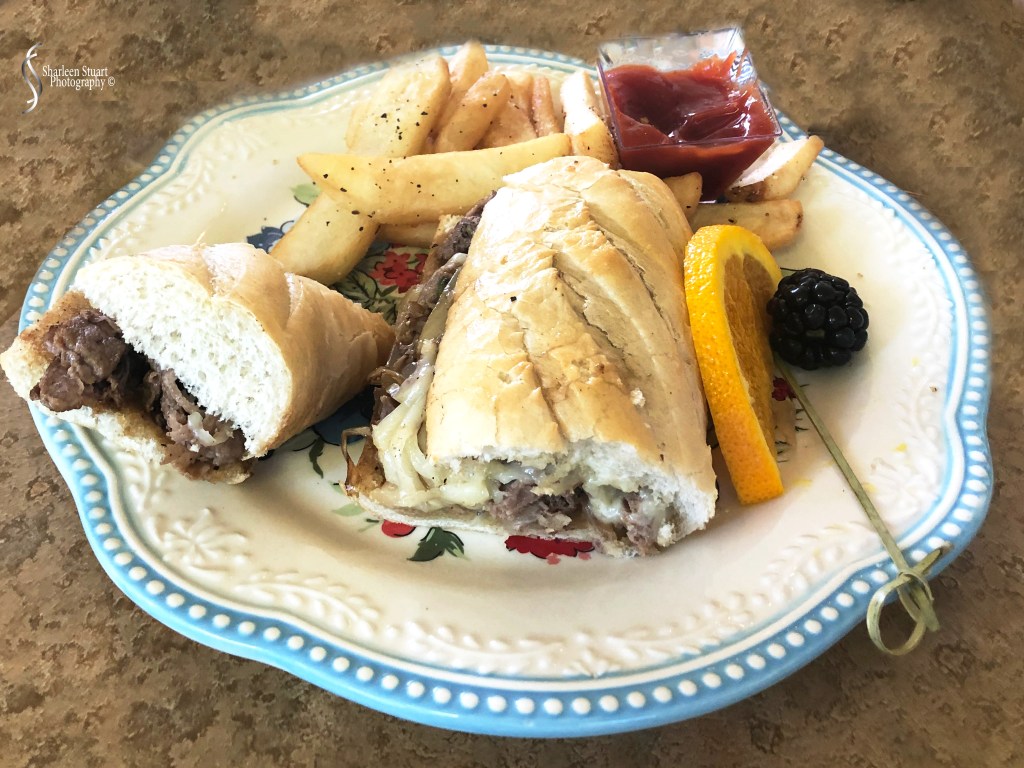I snapped two cellphone pics of the food as I did not want to pull out the big old camera and annoy the rest of the family. The food, in case you were wondering, was excellent. I chose a lobster and crab salad, as seen above, tossed in a tangy sauce, served on a croissant, along with a potato salad side. Daniel, who was seated next to me, chose the Ultimate Philly Cheesesteak with caramelized onions, green peppers and swiss cheese, with a side of fries. There were six of us and I did not take photos of each persons food but it will definitely give you an idea of the options. I definitely recommend having lunch there.