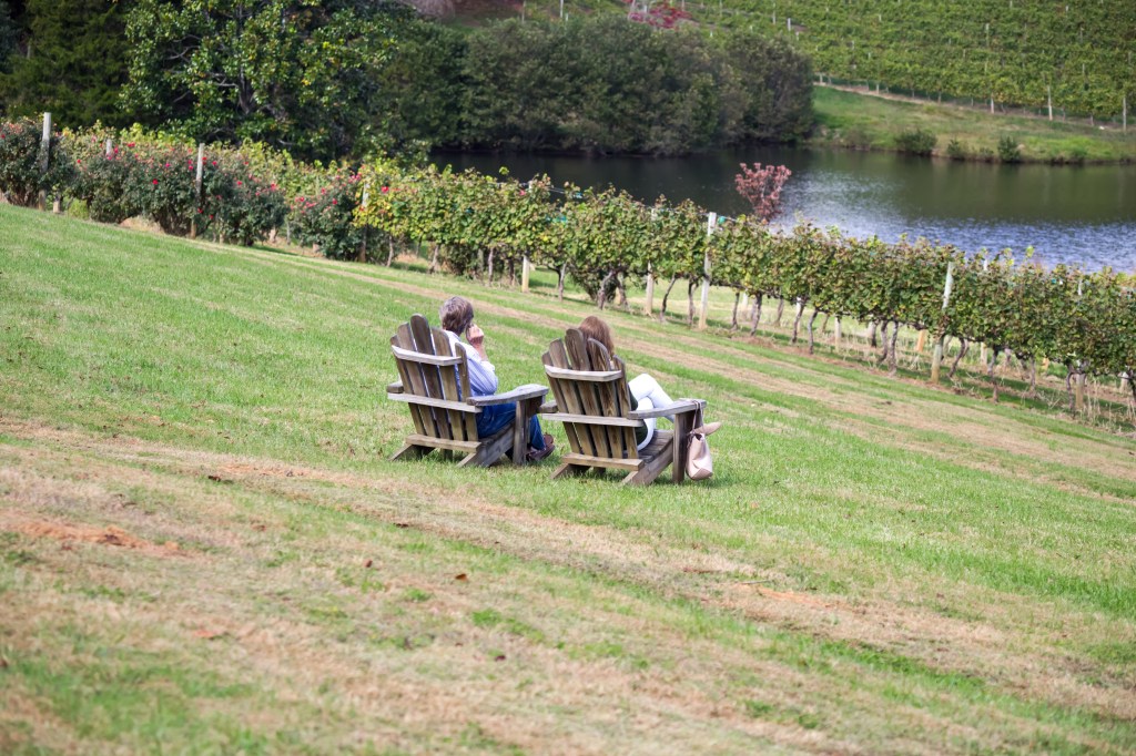 Due to Covid the wine tasting has been shifted outdoors . Beyond the tree below is a patio are where you can sit and taste your wine or you can walk back to the grass area and find a few chairs and relax and enjoy the view. We did do some wine tasting outside overlooking the lake and the vines.